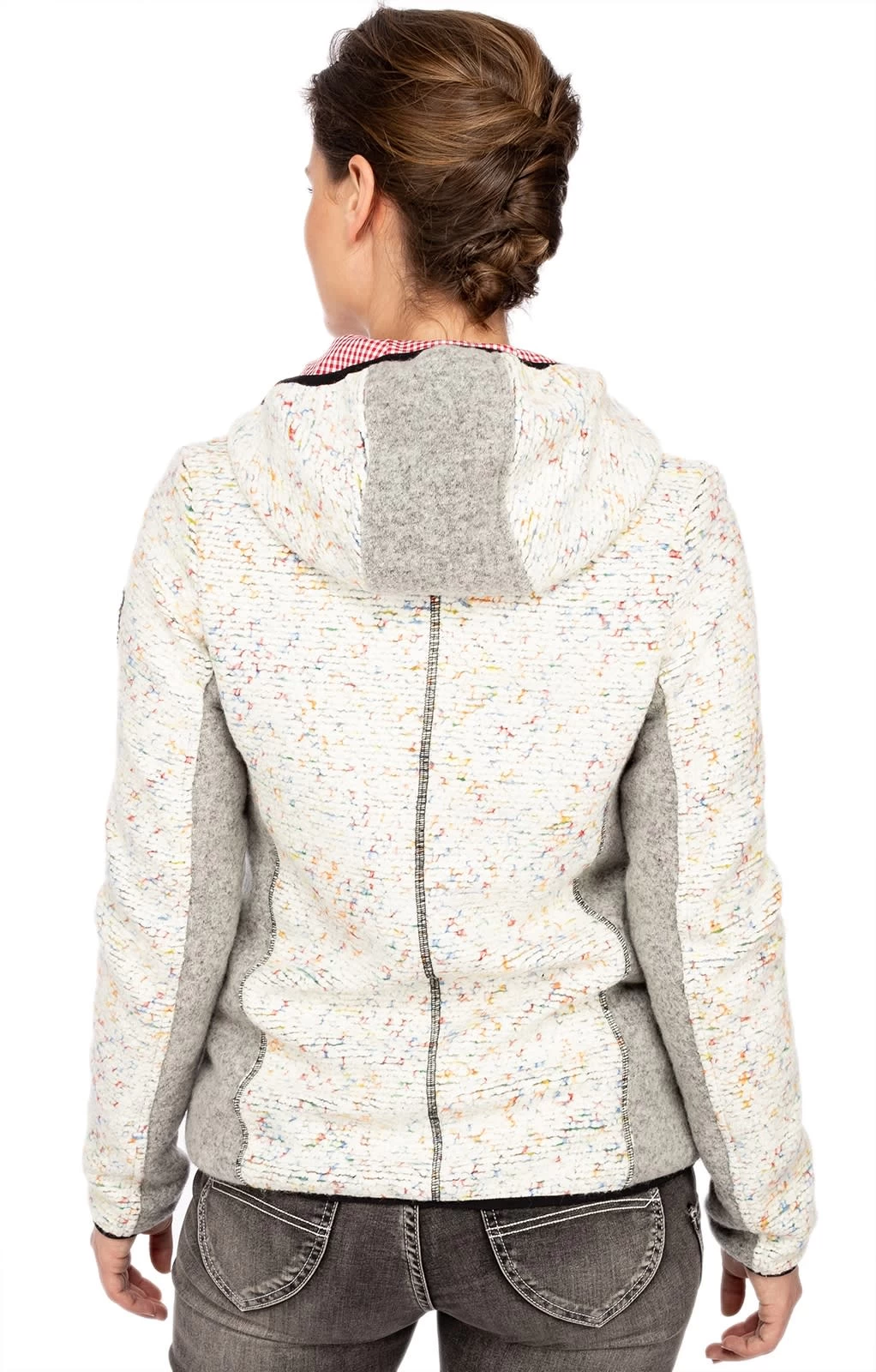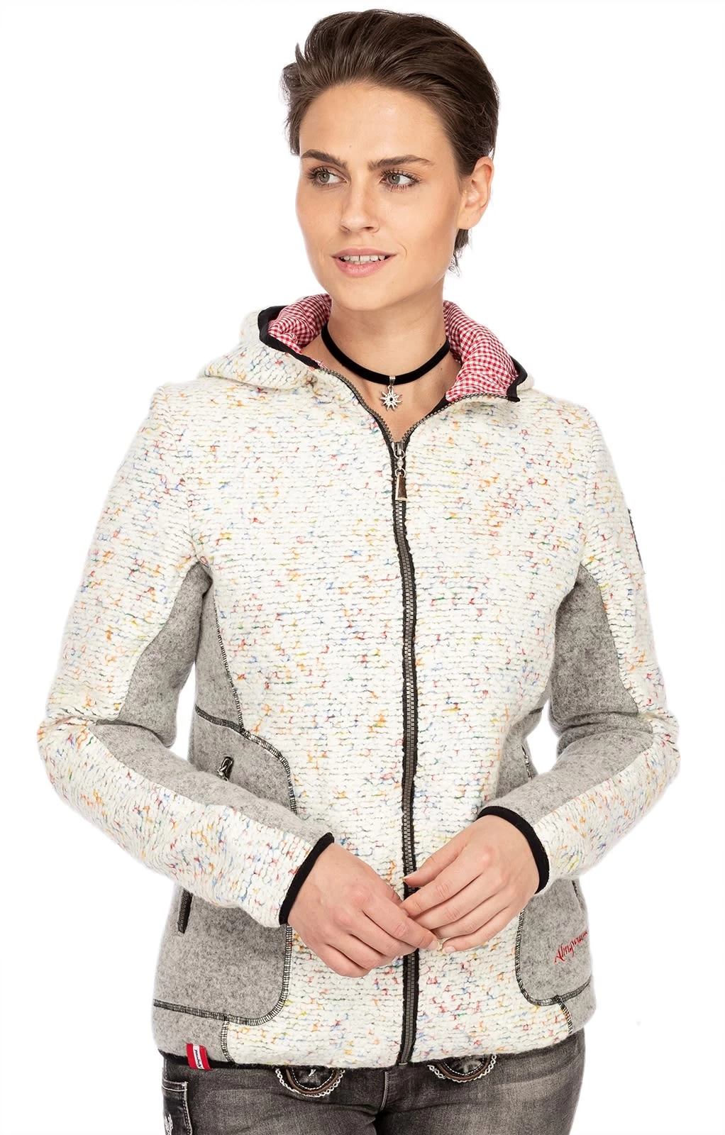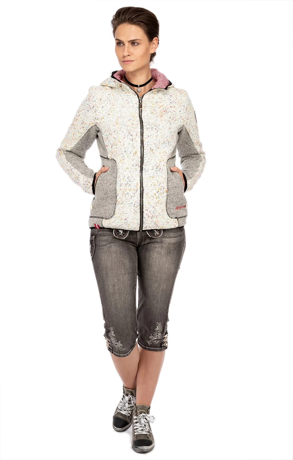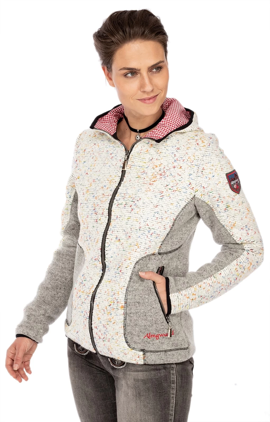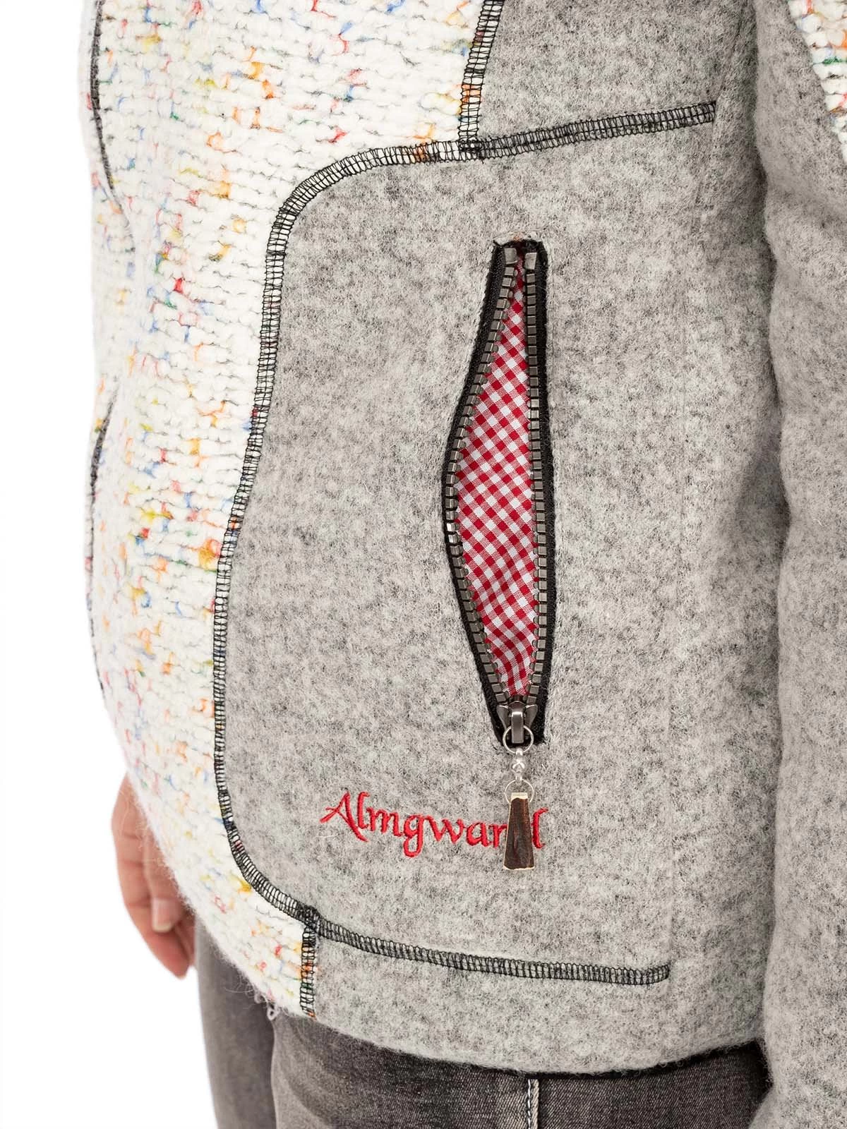 Sportliche Trachtenjacke mit Wolle. Die beige-graue Outdoorjacke GEIERHAUPT von Almgwand hat viel zu bieten. Der Materialmix mit Wolle und Schurwolle und das Innenfutter schützen vor Wind und kühlen Temperaturen. Optisch besticht das Oberteil für Damen durch den beigen Strick mit farbigen Akzenten. Auch die markanten Nähte, der schwarze Saum und die grau gepaspelten Seitentaschen prägen den ländlichen Look. Ein besonders schöner Hingucker ist die Kapuze mit ihrem rot karierten Innenfutter.•Diese Trachten Jacke fällt größengerecht aus. •Almgwand •Oberstoff: 36% Polyacryl 35% Polyester 29% Wolle, Oberstoff2: 80% Schurwolle 20% Polyamid, Oberstoff •Damen