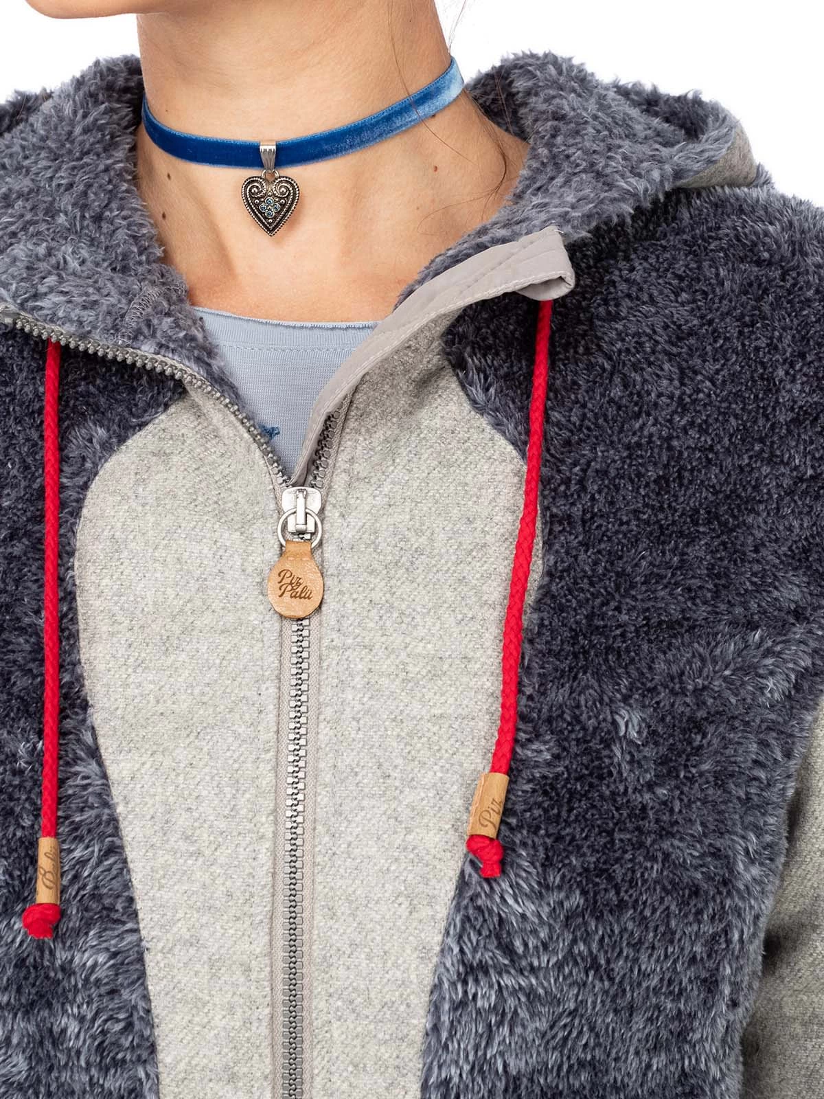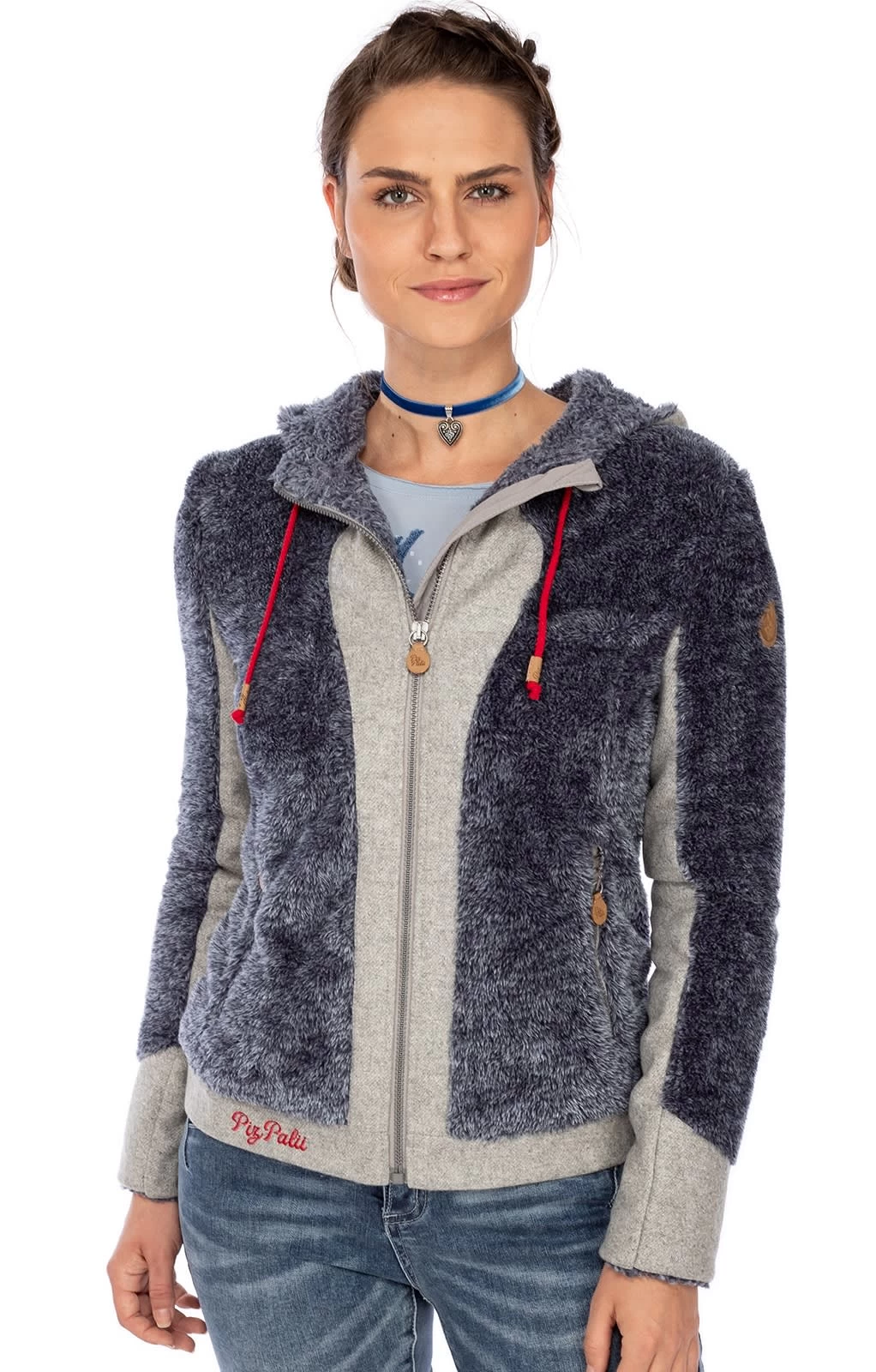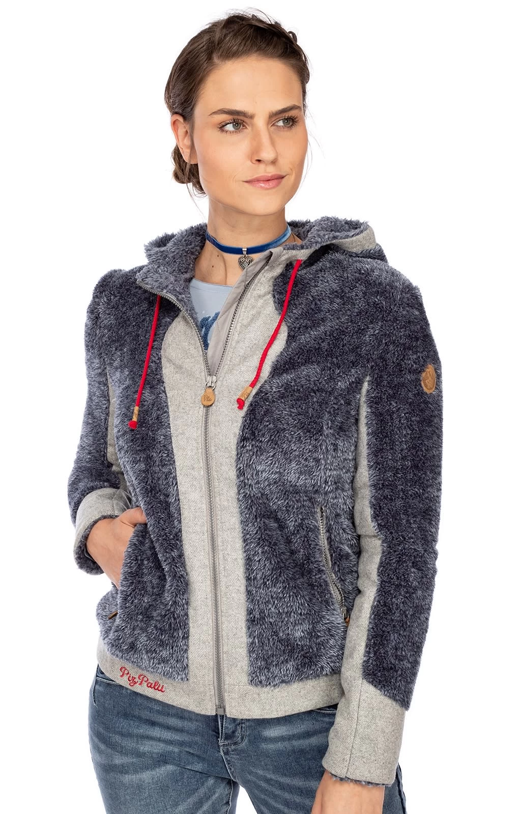 Flauschige Damenjacke mit Kapuze. Die jugendliche Damenjacke Gauting aus kuscheligem blauem Plüsch und grauem Webstoff ist ein toller Begleiter zur sportlichen Jeans. Als Verschluss dient ein Zipper. Der Wollanteil liegt bei 60 Prozent, sodass die Jacke auch bei niedrigen Temperaturen angenehm warm hält. Für ein kontrastreiches Highlight sorgt die rote Kordel der Kapuze. Zudem verfügt das Modell über zwei seitliche Einschubtaschen, die sich ebenfalls mit einem Zipper verschließen lassen.•Diese Trachten Jacke fällt größengerecht aus. •Piz Palü •100% Polyester, Oberstoff2 60% Wolle 20% Polyamid 15% Nylon 5% andere Fasern •Damen