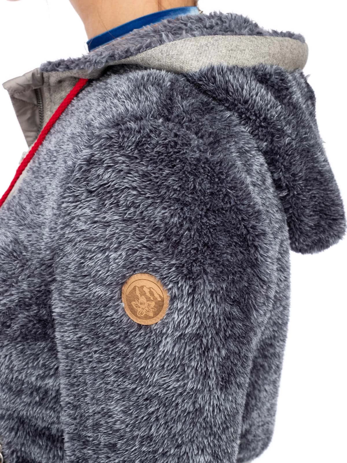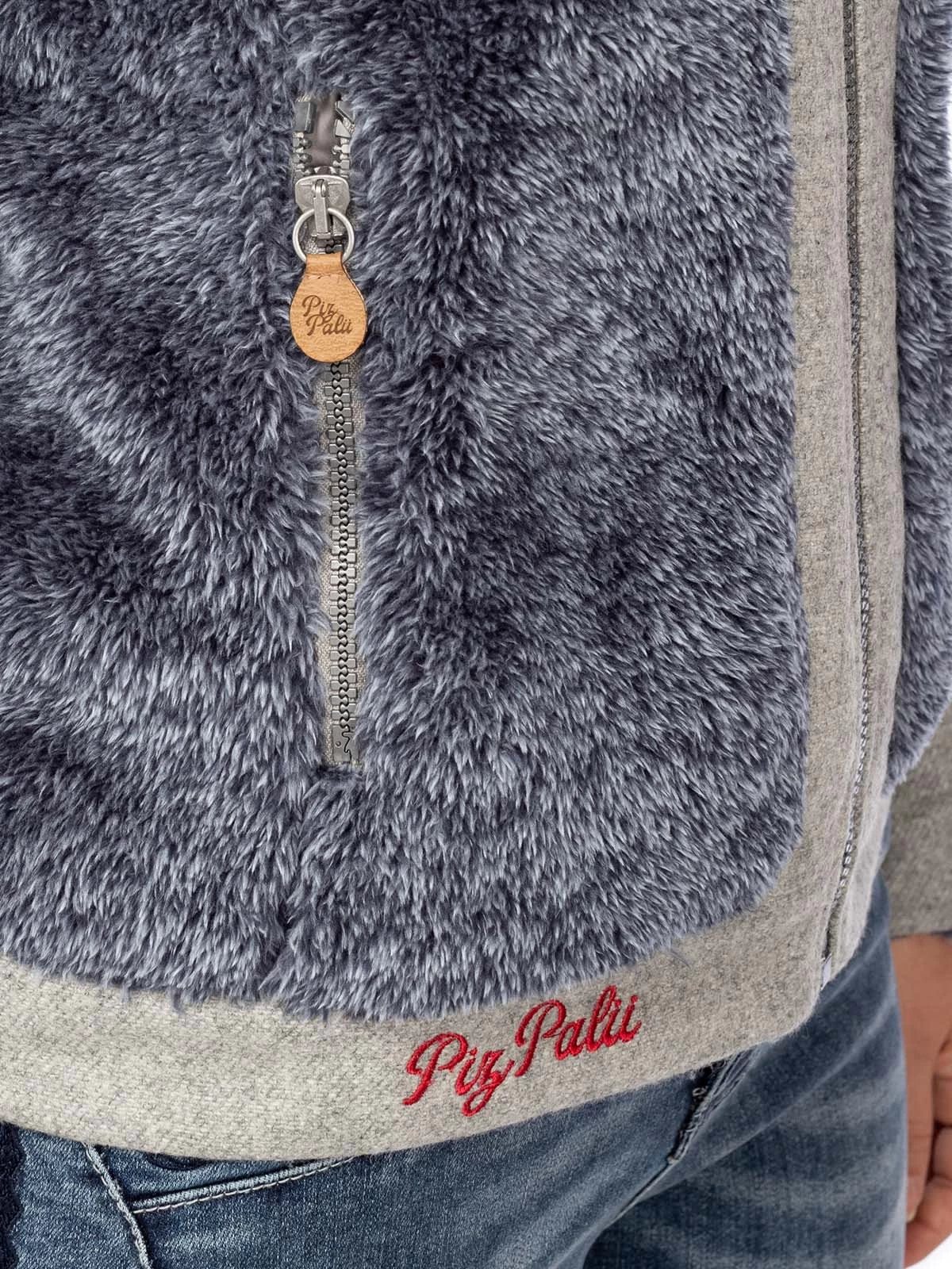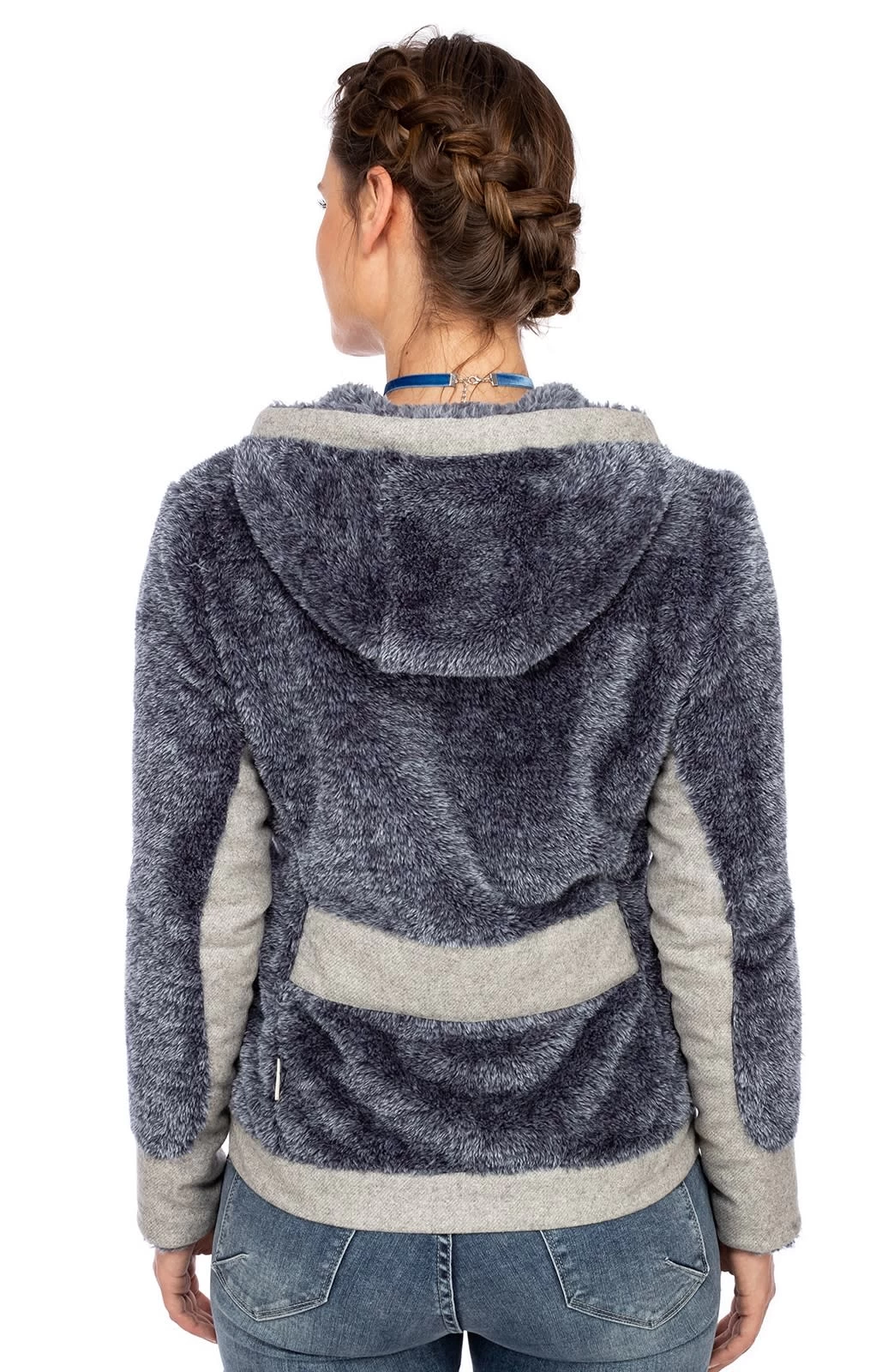 Flauschige Damenjacke mit Kapuze. Die jugendliche Damenjacke Gauting aus kuscheligem blauem Plüsch und grauem Webstoff ist ein toller Begleiter zur sportlichen Jeans. Als Verschluss dient ein Zipper. Der Wollanteil liegt bei 60 Prozent, sodass die Jacke auch bei niedrigen Temperaturen angenehm warm hält. Für ein kontrastreiches Highlight sorgt die rote Kordel der Kapuze. Zudem verfügt das Modell über zwei seitliche Einschubtaschen, die sich ebenfalls mit einem Zipper verschließen lassen.•Diese Trachten Jacke fällt größengerecht aus. •Piz Palü •100% Polyester, Oberstoff2 60% Wolle 20% Polyamid 15% Nylon 5% andere Fasern •Damen