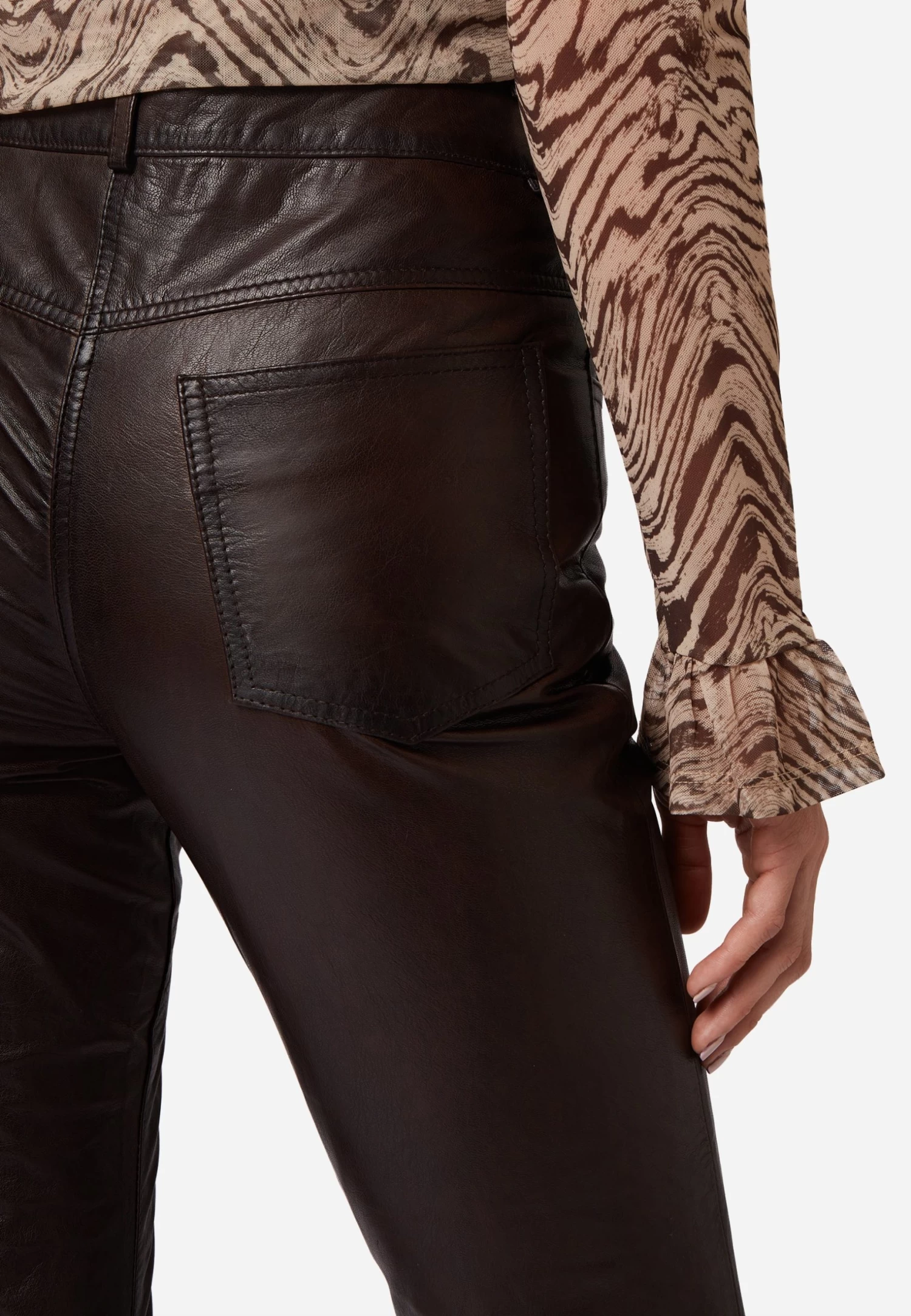 Lederhose 9809 in Braun für Damen von Ricano® aus Lamm-Nappa Leder – Regular Waist / Medium Rise – Femininer und figurbetonter Slim Fit – Futter: 100% atmungsaktives Polysatin – Ganzjahresartikel – von Frühling bis Winter zu jeder Jahreszeit passend – Größenausfall: Artikel fällt eine Nummer kleiner aus – Bitte eine Nummer größer wählen als gewohnt – Italienisches Fitting. Enthält nichttextile Bestandteile tierischen Ursprungs.