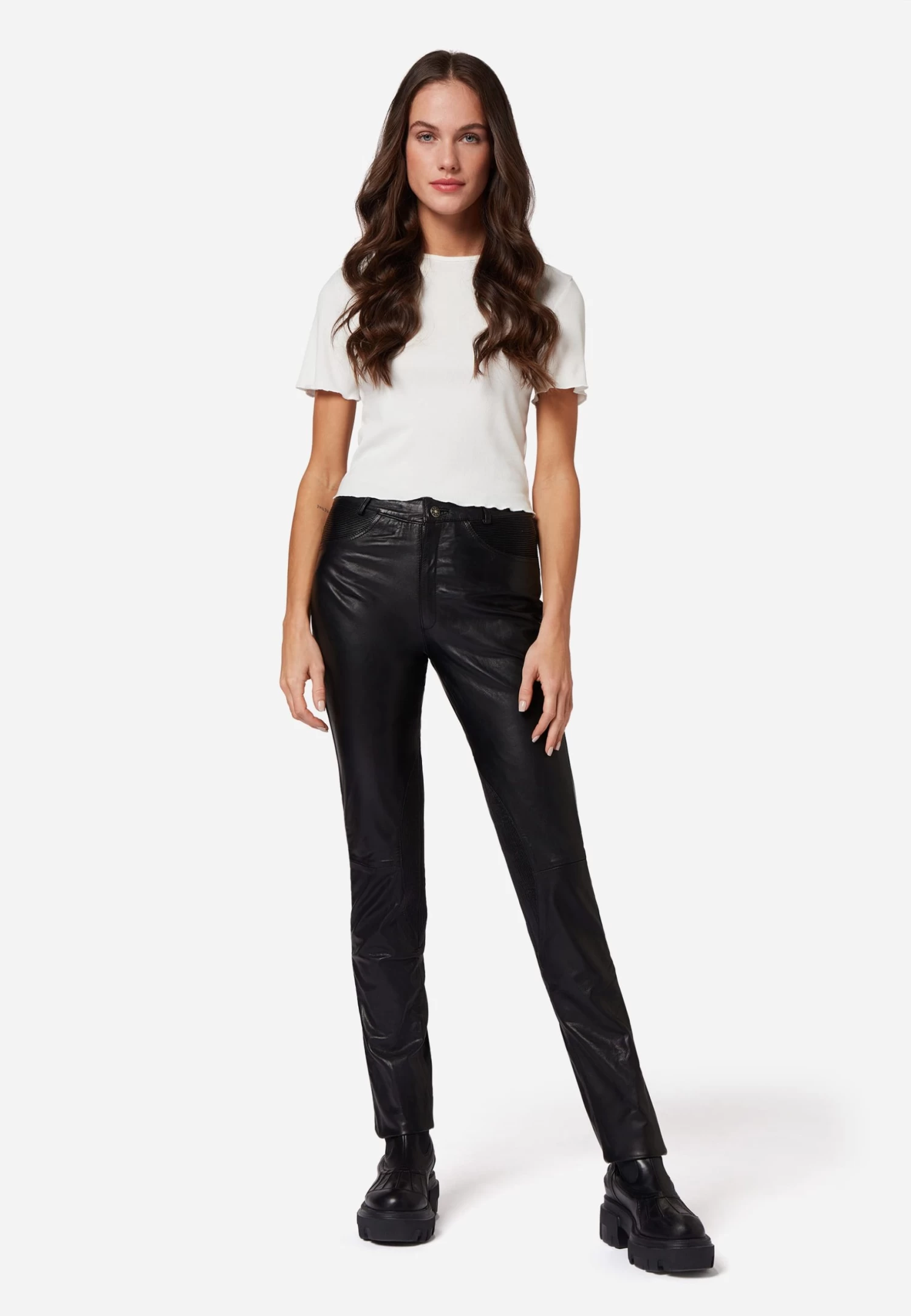 Lederhose 9810 in Schwarz für Damen von Ricano® aus Ziegen-Nappa Leder – Regular Waist / Medium Rise – Femininer und figurbetonter Slim Fit – Futter: 100% atmungsaktives Polysatin – Ganzjahresartikel – von Frühling bis Winter zu jeder Jahreszeit passend – Größenausfall: Artikel fällt eine Nummer kleiner aus – Bitte eine Nummer größer wählen als gewohnt – Italienisches Fitting. Enthält nichttextile Bestandteile tierischen Ursprungs.