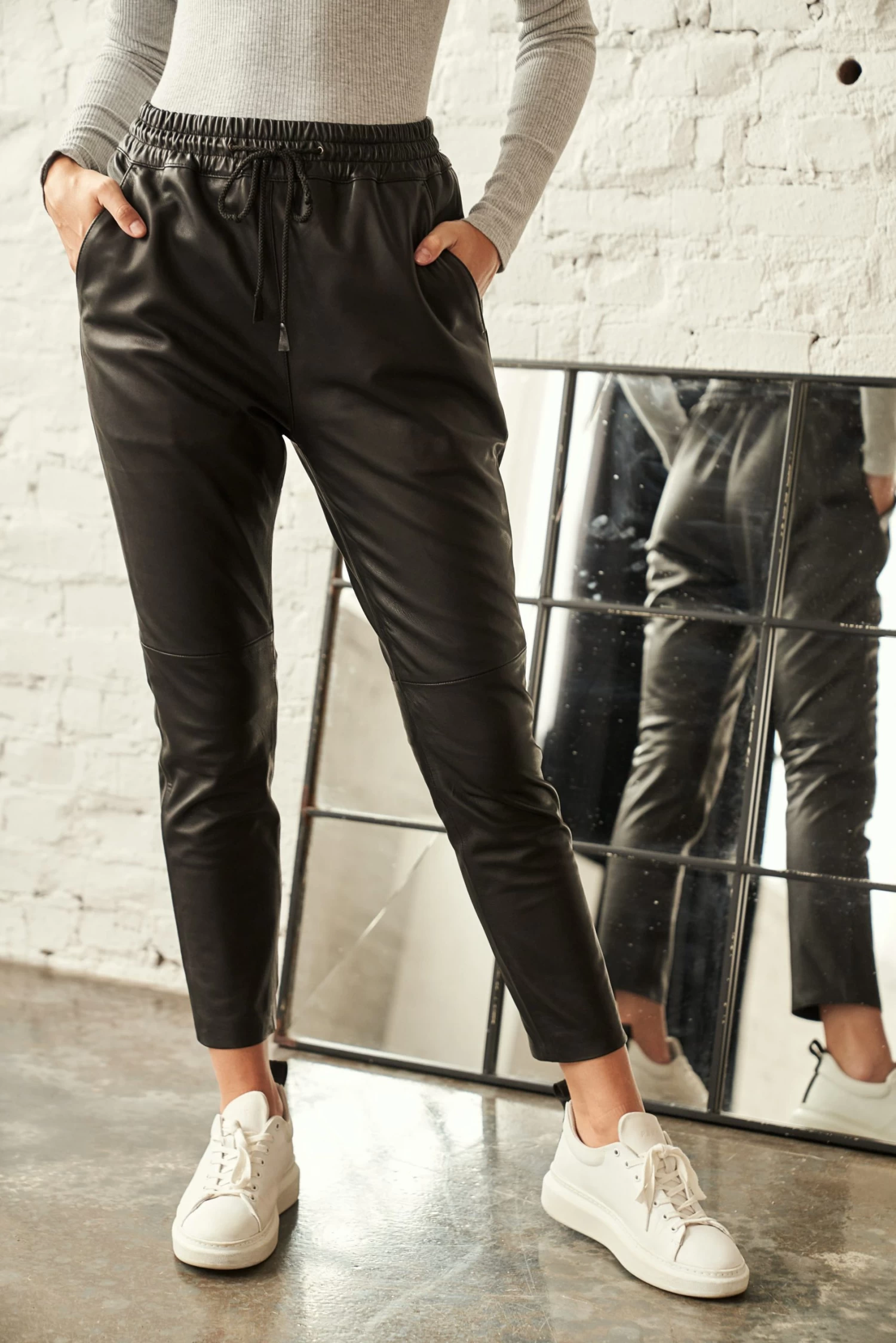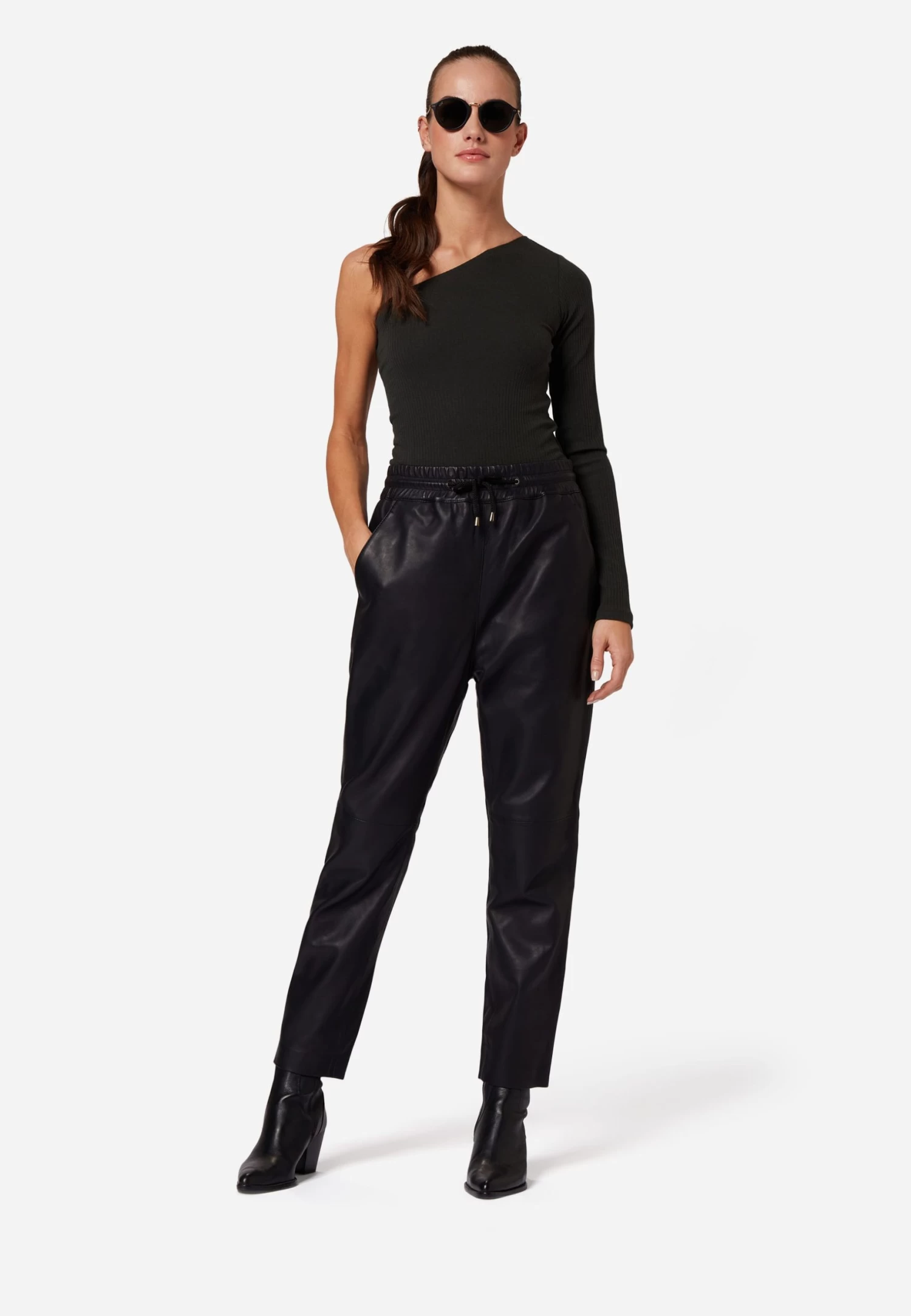 Lederhose Carillo in Schwarz für Damen von Ricano® aus Lamm-Nappa Leder – Jogg-Pant – Regular Waist / Medium Rise – Femininer und figurbetonter Slim Fit – Futter: keine Fütterung – das exzellent gegerbte und aschmiegsame Leder trägt sich wie eine zweite Haut – hoher Tragekomofort – Ganzjahresartikel – von Frühling bis Winter zu jeder Jahreszeit passend – Größenausfall: Artikel fällt eine Nummer kleiner aus – Bitte eine Nummer größer wählen als gewohnt – Italienisches Fitting. Enthält nichttextile Bestandteile tierischen Ursprungs.