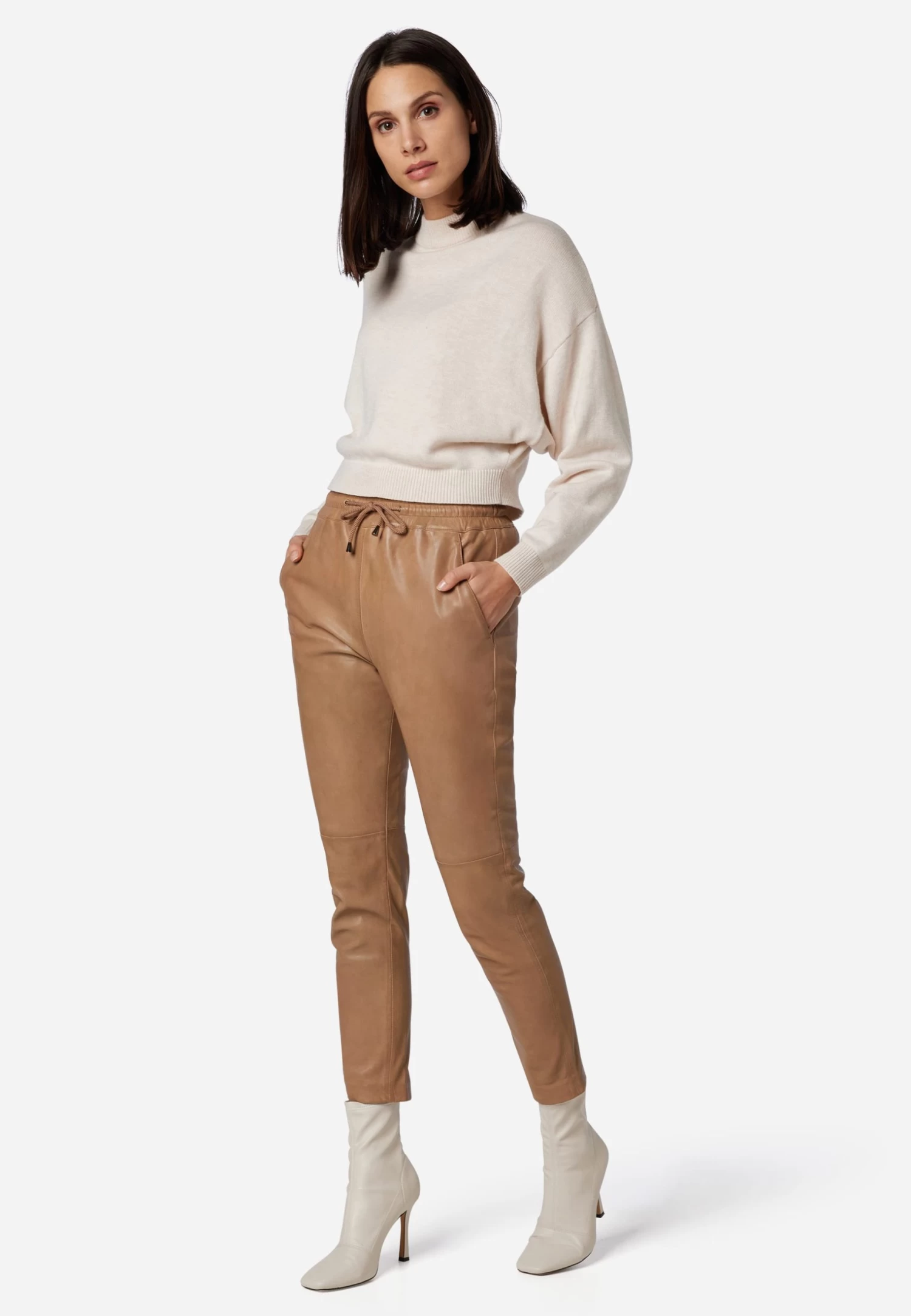 Lederhose Carillo in Taupe für Damen von Ricano® aus Lamm-Nappa Leder – Jogg-Pant – Regular Waist / Medium Rise – Femininer und figurbetonter Slim Fit – Futter: keine Fütterung – das exzellent gegerbte und aschmiegsame Leder trägt sich wie eine zweite Haut – hoher Tragekomofort – Ganzjahresartikel – von Frühling bis Winter zu jeder Jahreszeit passend – Größenausfall: Artikel fällt eine Nummer kleiner aus – Bitte eine Nummer größer wählen als gewohnt – Italienisches Fitting. Enthält nichttextile Bestandteile tierischen Ursprungs.