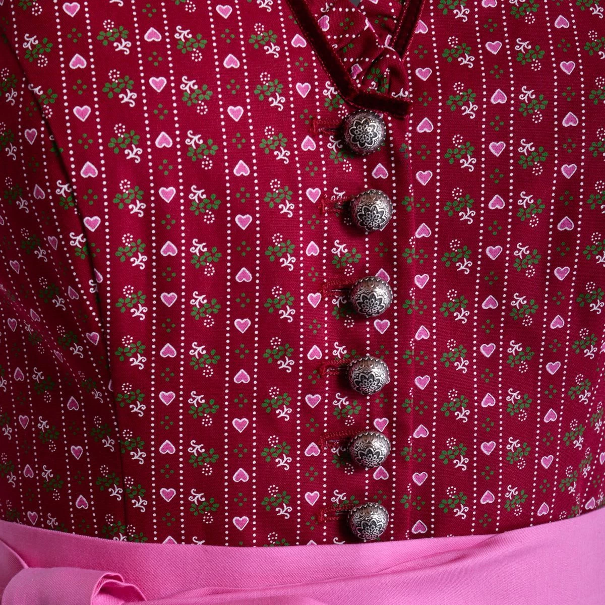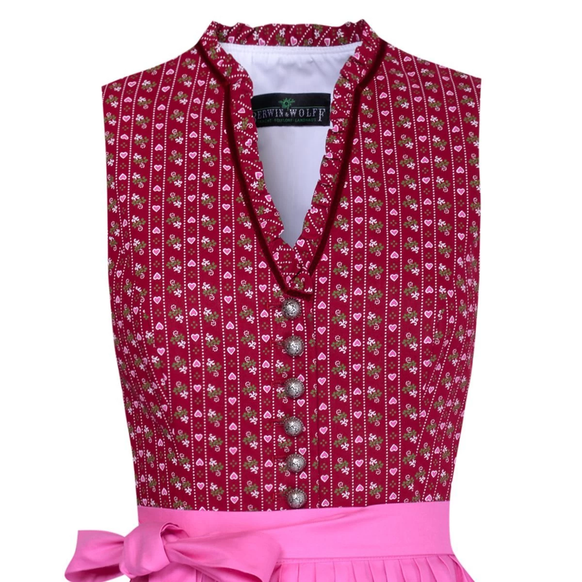 Ein schickes midi Dirndl Ralene in Rot von Berwin und Wolff. Das Dirndlmieder hat einen eleganten Stehkragen und einen V-Ausschnit. Am Ausschnitt entlang zieht sich eine Rüschenborte. Das Dirndl ist durchgehend mit Herzen, Ornamenten und Punkten versehen. Die Dirndlschürze ist schlicht in Pink gehalten. Der Dirndlrock hat eine Länge von 70 Zentimetern.Hinweis: Die Schlaufenbänder, mit denen die Dirndlschürze am Dirndl gehalten wird dienen lediglich der Aufbewahrung und dem Transport der Schürze. Sie können diese abtrennen und sollte die Schürze ohne deren Verwendung binden. So sind Sie mit der Dirndlschürze in der Höhe flexibel.Unser Tipp: Variieren Sie z. B. zwischen weißen und schwarzen Dirndlblusen, viele unserer Dirndl können mit beiden Farben und verschiedenen Dirndlblusen (z. B. Langarmbluse, Kurzarmbluse) getragen werden. Zudem können fast alle unsere Dirndl für kleines Geld (ca. 15 Euro) beim Schneider angepasst werden wenn es einmal nicht passt. So wird ein wunderschönes Dirndl zu Ihrem perfekt sitzenden Dirndl Unikat!Damen Dirndl Rot finden Sie in verschiedenen Ausführungen und Formen. Ob sie ihr Dirndl Rot Damen lieber mit einer hochgeschlossenen Bluse oder etwas freizügiger tragen wollen bleibt Ihnen selbst überlassen. Ein schlichtes Dirndl lang Rot oder ein verspieltes Dirndl kurz Rot mit Rüschen und Verzierungen. In der Dirndl Fashion ist hier alles erlaubt! Für das richtige Dirndldekolleté holen Sie sich einen Dirndl BH, wie z.B. den My Choice Dirndl Push-Up BH in Weiß oder Hammerschmid Dirndl BH in Weiß. So wird ihr Mädchen Dirndl Rot zum echten Hingucker!
