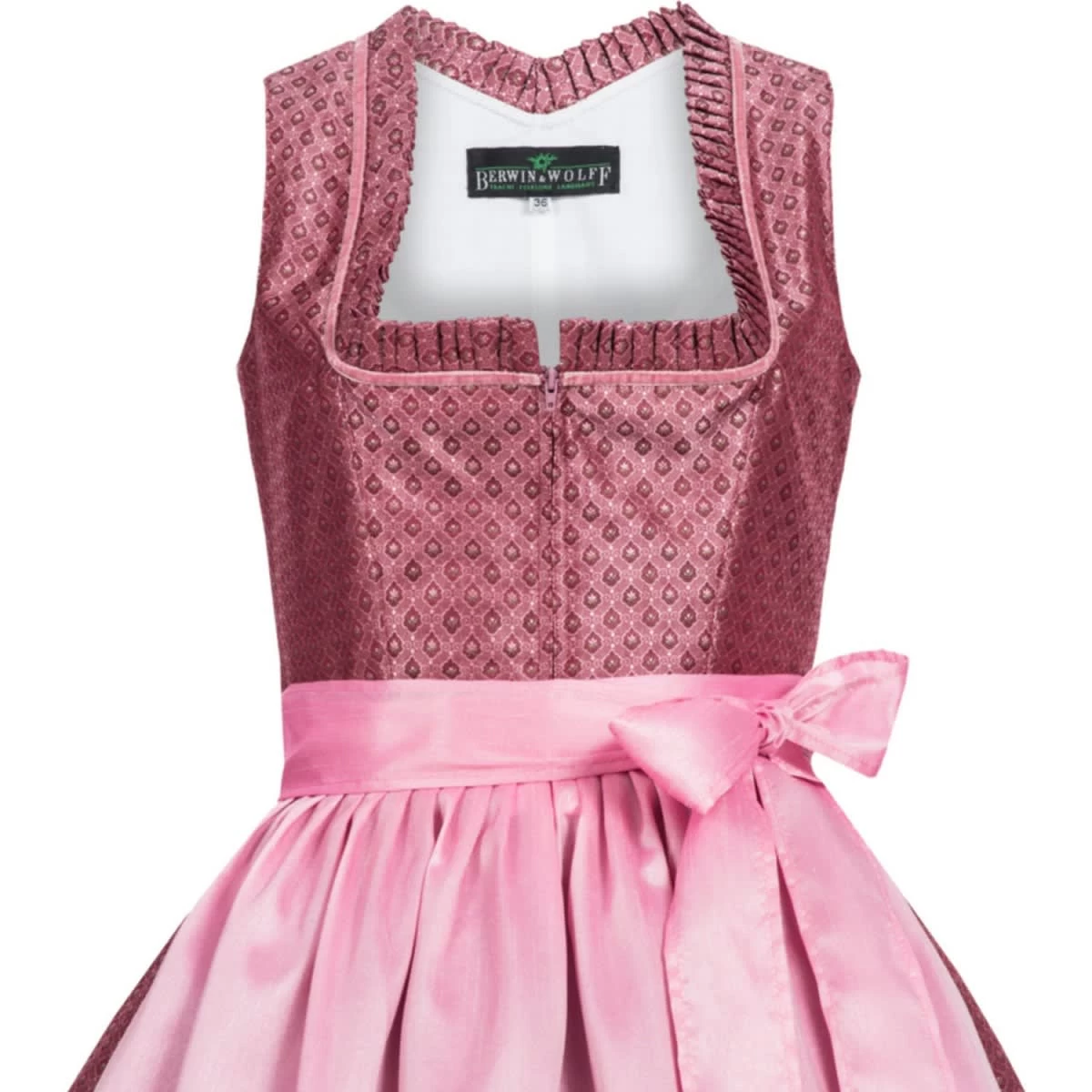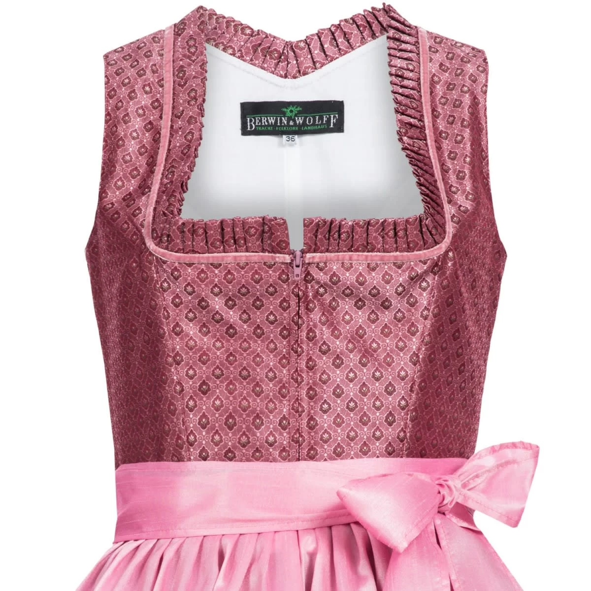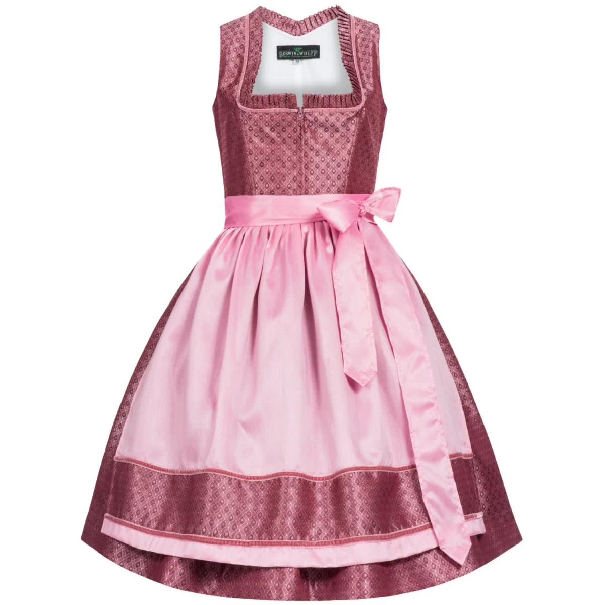 Das zauberhafte midi Dirndl Elisia in Weinrot von der Marke Berwin und Wolff! Das Dirndl ist mit Blumen und Ranken verziert und lässt sich mit einem Reißverschluss öffnen. Am Dekolleté entlang zieht sich eine Rüschenborte. Die Dirndlschürze ist in Pink und am Ende mit demselben Muster versehen wie die Tracht. Diese Tracht ist sehr bequem und angenehm zu tragen. Der Dirndlrock ist 70 cm lang.Hinweis: Die Schlaufenbänder, mit denen die Dirndlschürze am Dirndl gehalten wird dienen lediglich der Aufbewahrung und dem Transport der Schürze. Sie können diese abtrennen und sollte die Schürze ohne deren Verwendung binden. So sind Sie mit der Dirndlschürze in der Höhe flexibel.Unser Tipp: Variieren Sie z. B. zwischen weißen und schwarzen Dirndlblusen, viele unserer Dirndl können mit beiden Farben und verschiedenen Dirndlblusen (z. B. Langarmbluse, Kurzarmbluse) getragen werden. Zudem können fast alle unsere Dirndl für kleines Geld (ca. 15 Euro) beim Schneider angepasst werden wenn es einmal nicht passt. So wird ein wunderschönes Dirndl zu Ihrem perfekt sitzenden Dirndl Unikat!