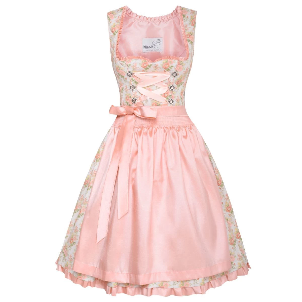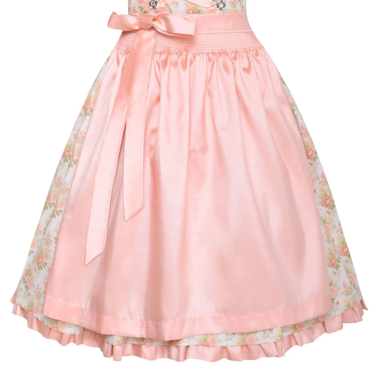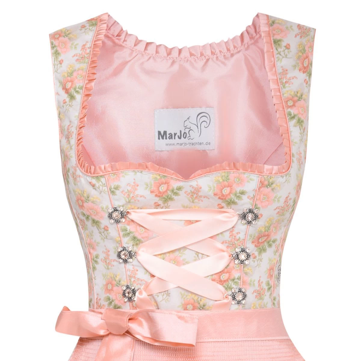 Ein sehr sommerliches mini Dirndl Tassja in Weiß von Marjo Trachten. Dieses traumhafte Dirndl hat ein sehr schönes weißes Mieder mit tollen Blütenmotiven in verschiedenen Tönen. Passend dazu gibt es für die Schnürung ein Satinband in Altrosa. Die Hakenvorrichtungen sind ebenfalls in einem Blütendesign gehalten. Dieses Dirndl hat einen neckischen Rock in Weiß mit Blütenmotiven und toller Spitze am Rocksaum. Die mitgelieferte schlichte Dirndlschürze ist passend zu diesem Dirndl in Altrosa. Der Dirndlrock misst eine Länge von 55 cm.Hinweis zur Abbildung: Sofern nicht anders beschrieben, werden unsere Dirndl ohne Dirndlbluse geliefert. Dirndl und Bluse können Sie bei uns in verschiedenen Größen bestellen, so passt die Tracht perfekt. Unser Tipp: Variieren Sie z. B. zwischen weißen und schwarzen Dirndlblusen, viele unserer Dirndl können mit beiden Farben und verschiedenen Dirndlblusen (z. B. Langarmbluse, Kurzarmbluse) getragen werden. Zudem können fast alle unsere Dirndl für kleines Geld (ca. 15 Euro) beim Schneider angepasst werden wenn es einmal nicht passt. So wird ein wunderschönes Dirndl zu Ihrem perfekt sitzenden Dirndl Unikat!