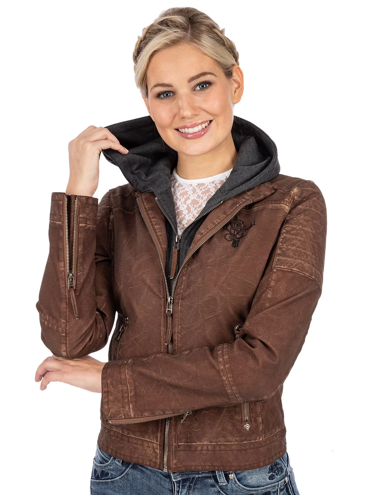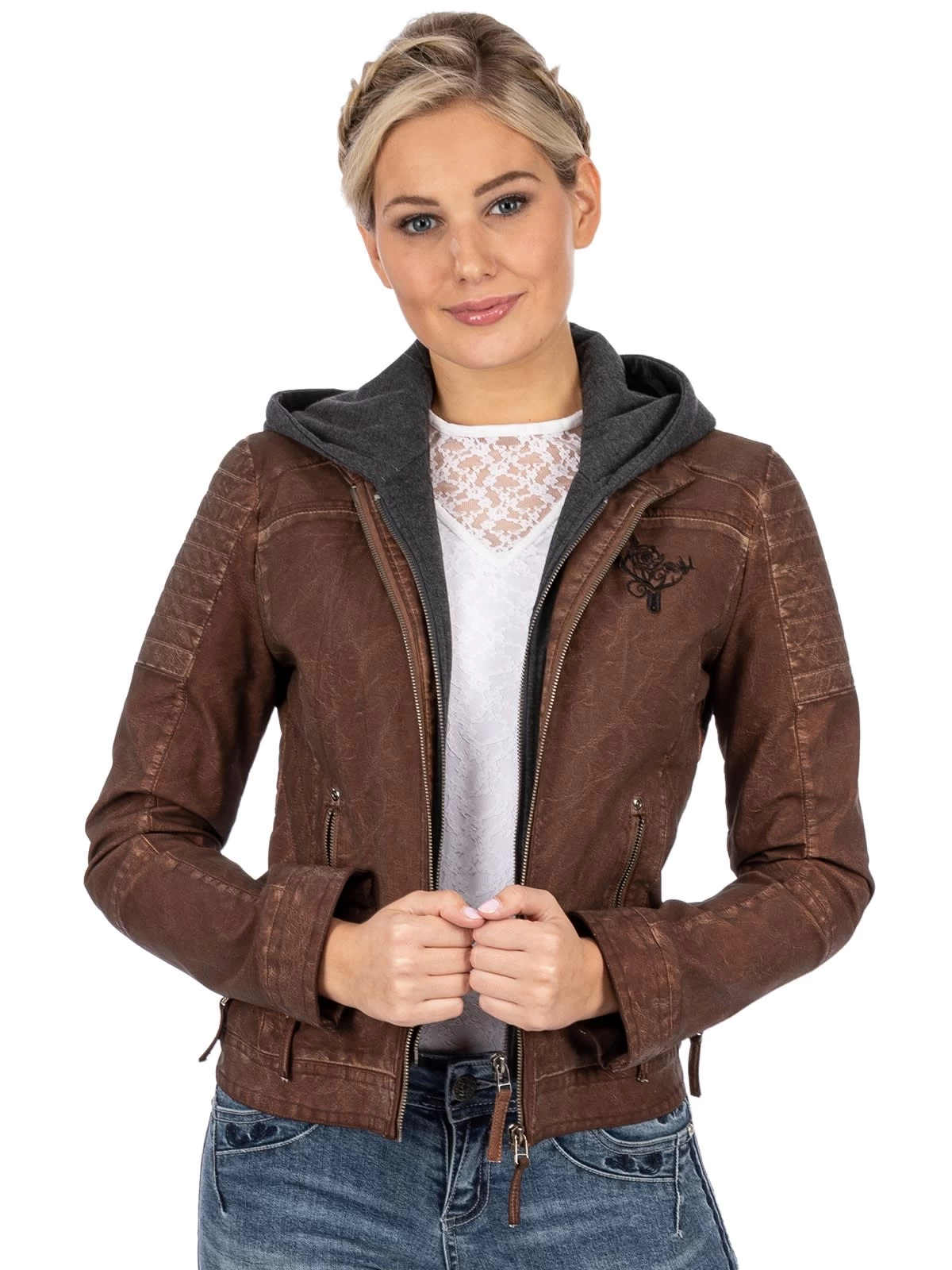 Modische Damenjacke von Hangowear. Auffälligstes Merkmal der Outdoorjacke HAILEY aus dem Hause Hangowear ist der angesagte 2-Lagen-Look, der diesem Modell aus unserem Onlineshop das gewisse Etwas gibt. Die Jacke in der Farbe Cognac verfügt über eine eingearbeitete Kapuze in Grau und ist am Rücken mit einer großen Logo-Stickerei samt Schriftzug versehen.•Diese Trachtenjacke fällt größengerecht aus. •Jacke •85% Viscose,15% Polyester, Futter1 100% Polyurethan, Futter2 100% Polyester
