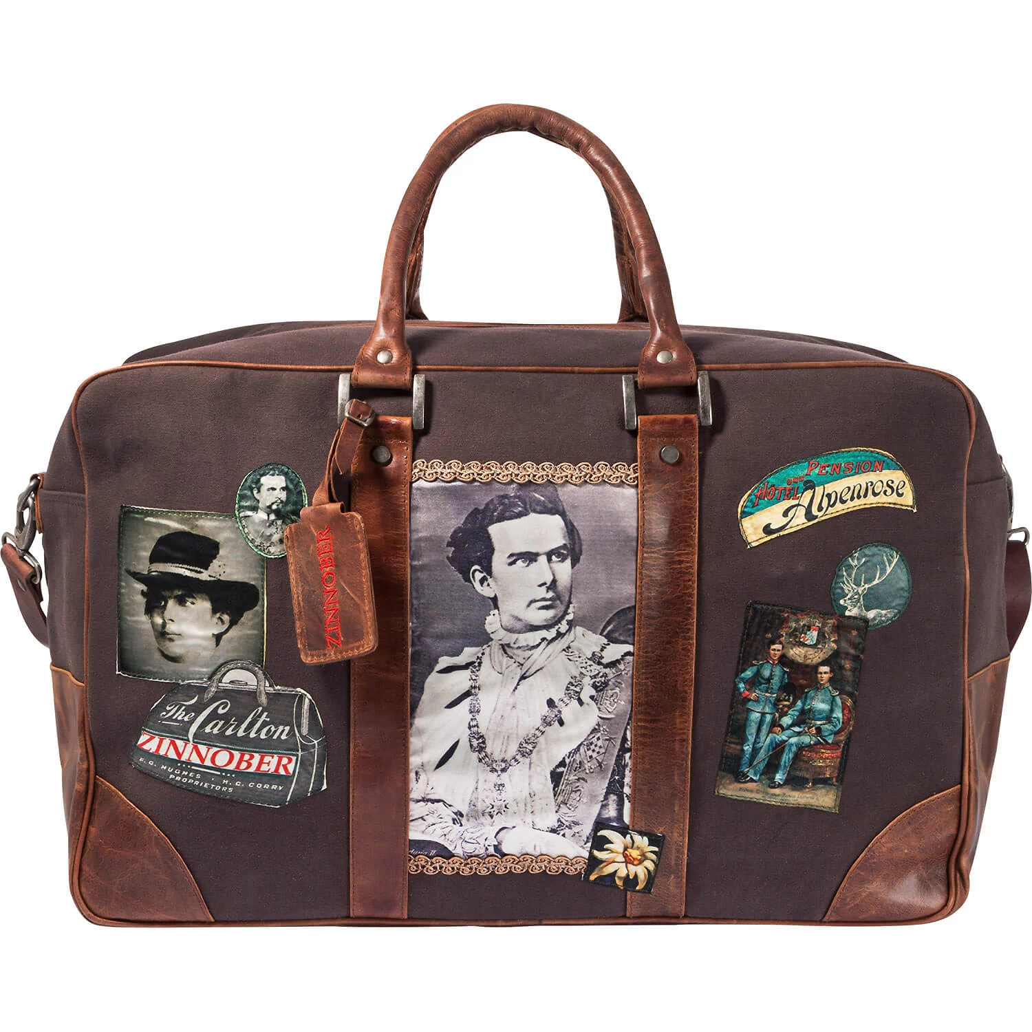 Aus Wiesnkönig’s Zinnober Kollektion – Die Reisetasche Ludwig gehört zu einer Serie von sportlichen Zinnober Taschen. Die Tasche ist ein stilvoller Reisebegleiter mit vintage Touch. Aus festem Canvas mit dickem Rindsleder verstärkt. Der Tragegurt ist längenverstellbar. Auf der Vorderseite der Tasche aufgesteppte Bilder von König Ludwig. Zusätzlich ein Adressanhänger aus Leder, die Tasche komplett eingfasst mit Lederkedern und auch der Boden ist aus Leder mit 5 Taschenfüssen. Innen komplett gefüttert mit einem Baumwollstoff und einer Reißverschlussinnentasche. Ein Weekender im Vintage look geeignet für kurze Reisen, kann aber genauso auch als stilvolle Sporttasche genutzt weden. Die Tasche kann lässig hängend über die Schulter getragen werden oder mit der Hand an den robusten Lederhenkeln.