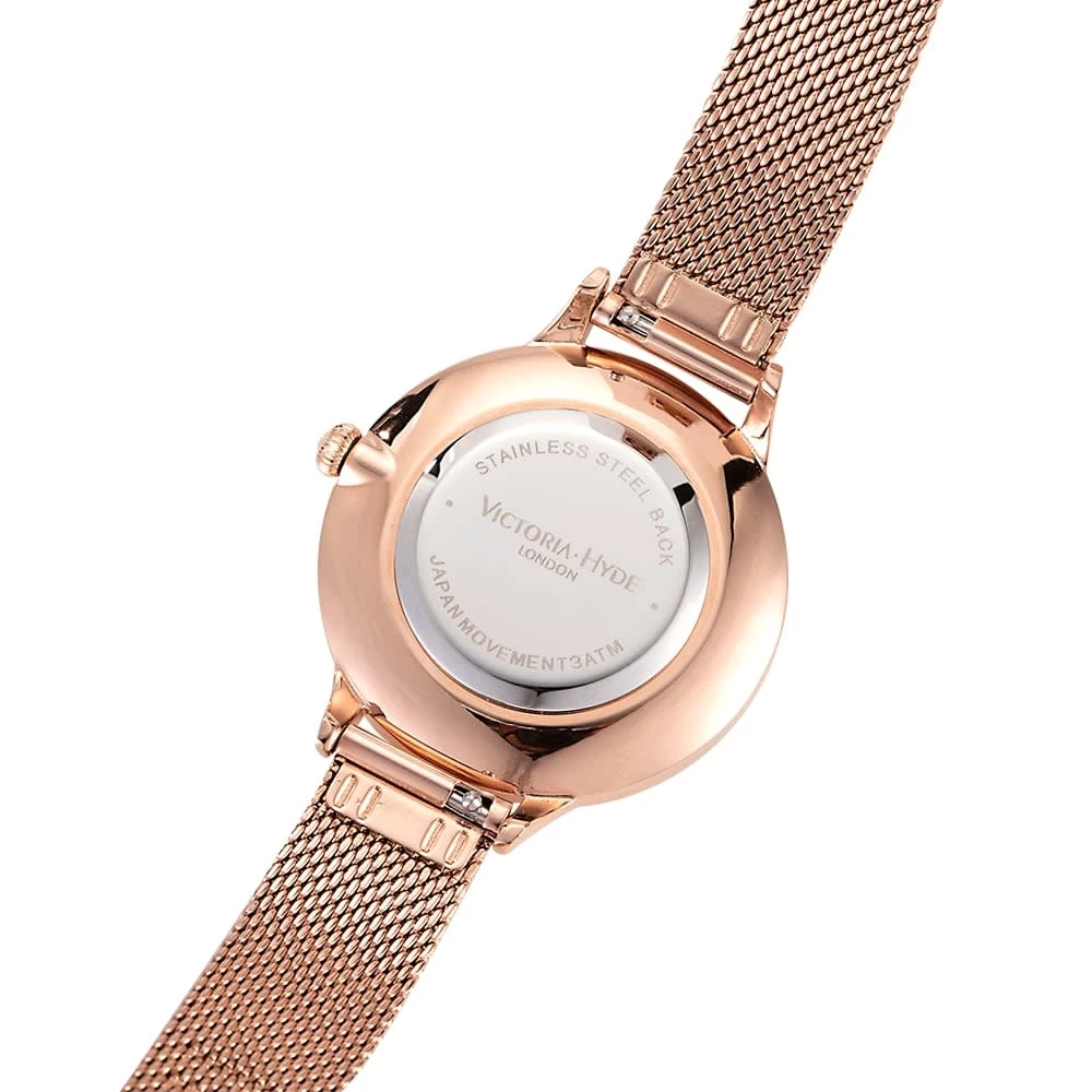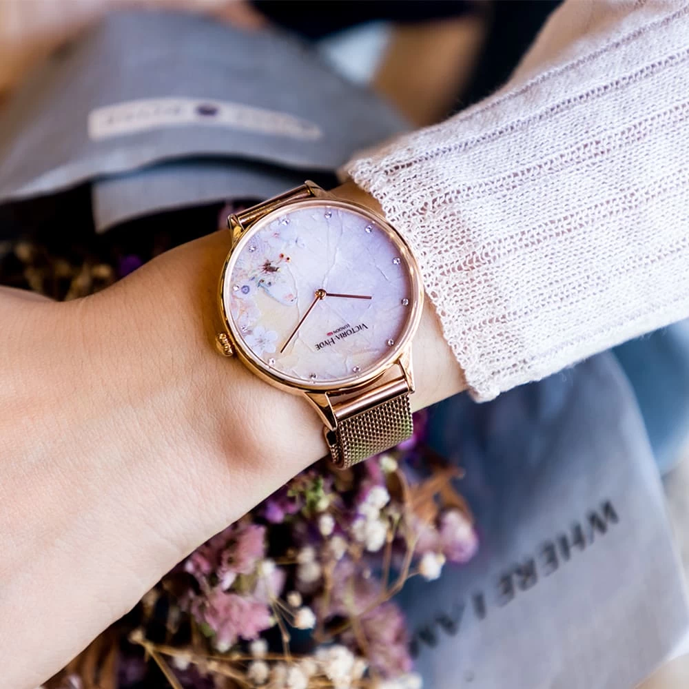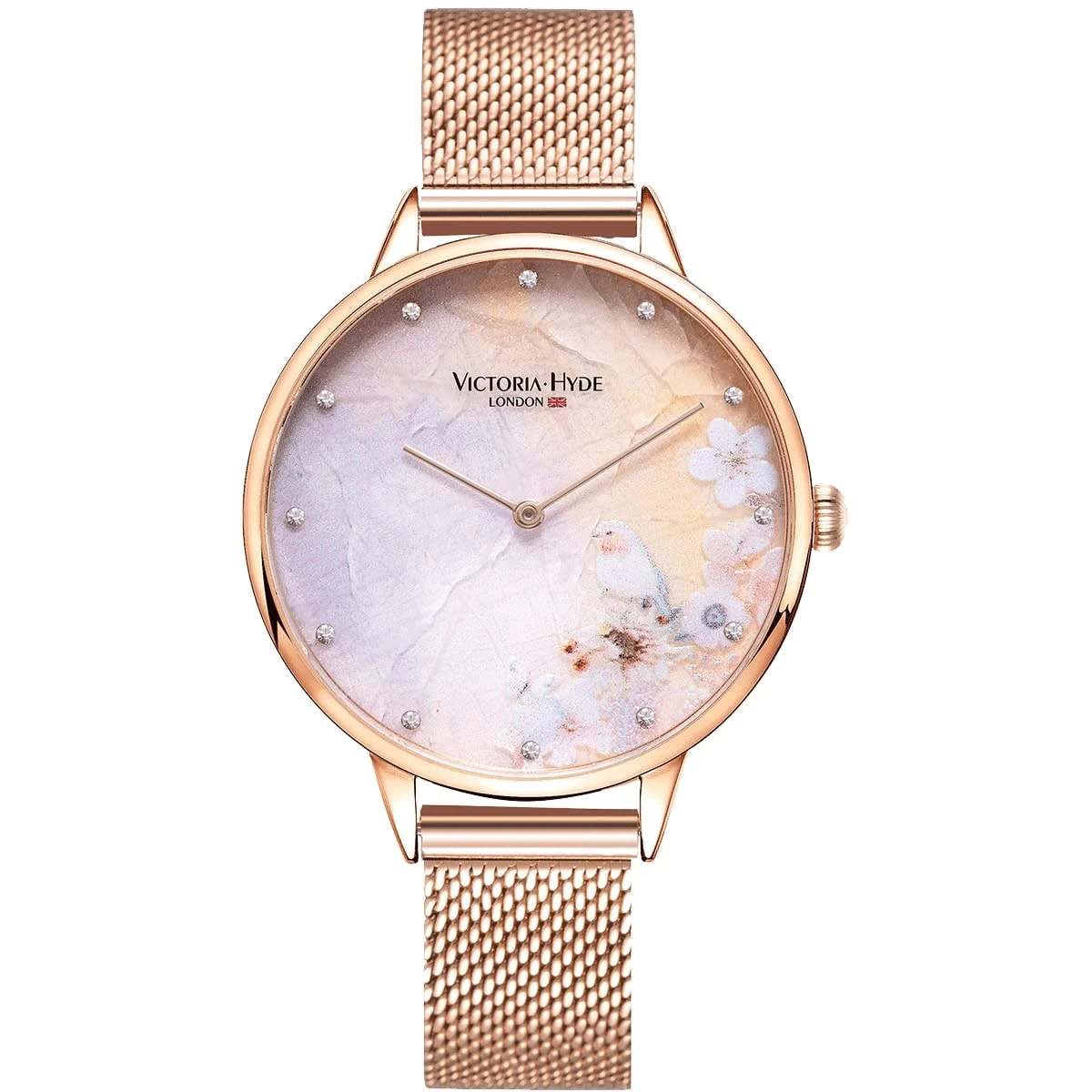 Auf dem Ziffernblatt der Tower Hill Haze Mesh Gold verschwimmen wunderschöne Pastelltöne und bilden in Kombination mit weißen Kirschblüten und einem kleinen weißen Vogel ein einzigartiges Muster. Finalisiert wird das verspielte Ziffernblatt mit funkelnden Perlen als Indizes. Darauf abgestimmt wurde das goldene Gehäuse mit passend elegantem Mesh Armband aus rostfreiem Edelstahl.