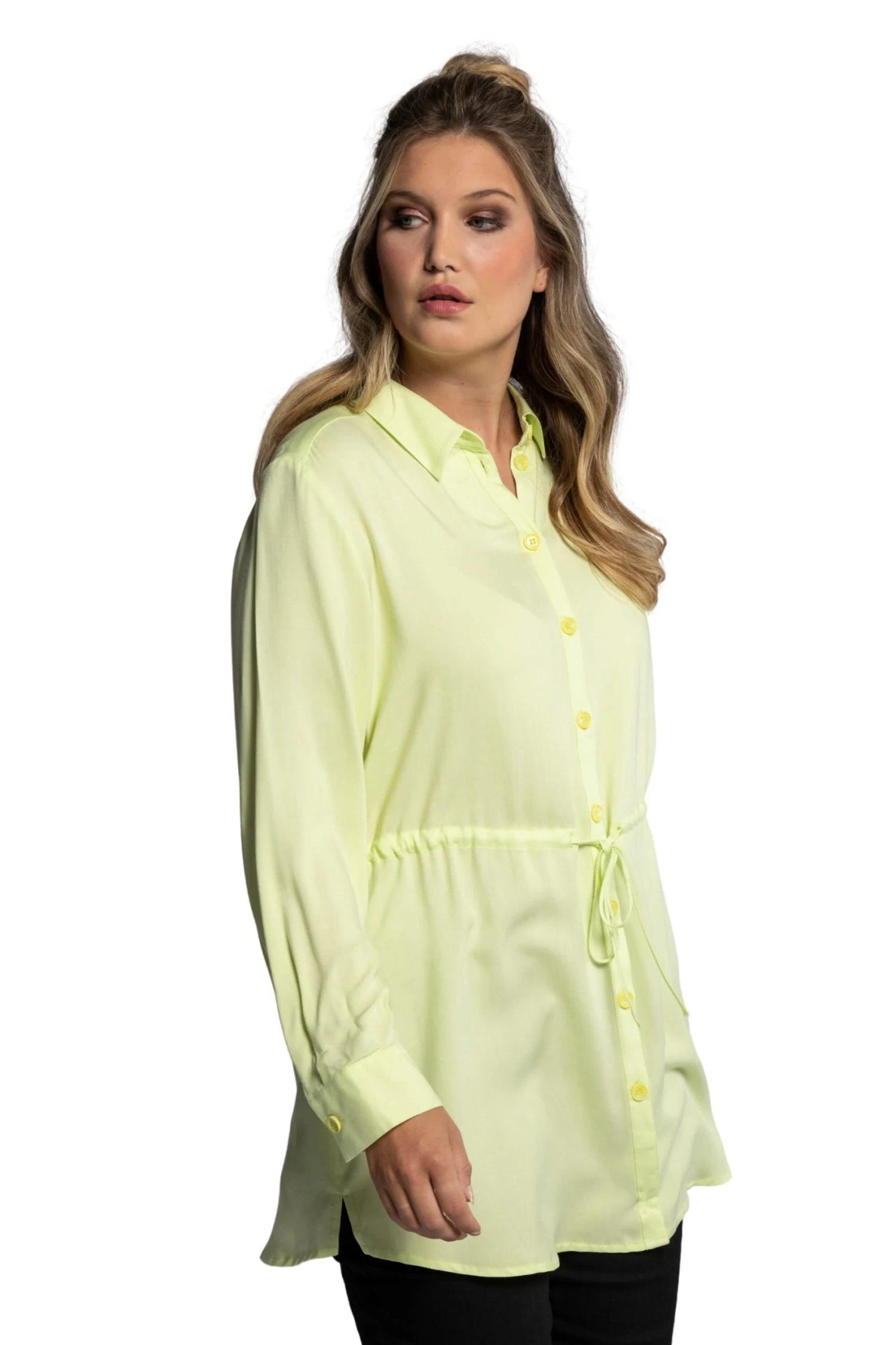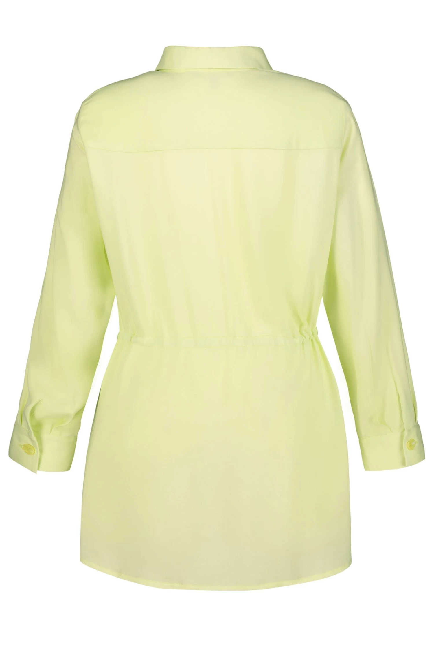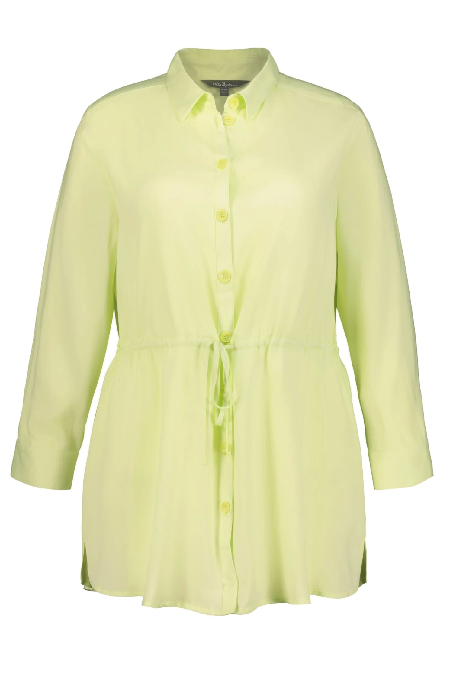 Blusenjacke mit Hemdkragen, durchgehender Knopfleiste und Bindeband in der Taille. Langarm mit Manschetten. Gerundeter Saum mit Seitenschlitzen.