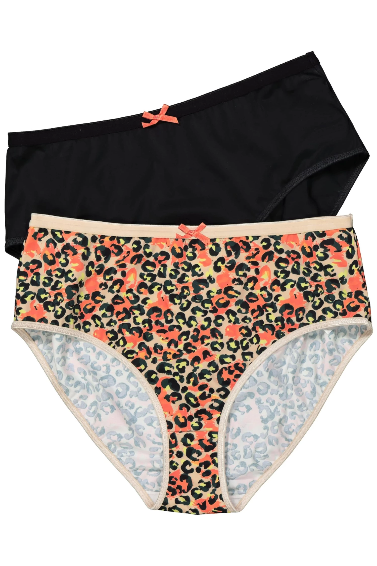 Slips im 2er-Pack. Je 1x mit Color-Leomuster und uni schwarz. Unser Model ist 1,87 m groß und trägt Größe 42/44.